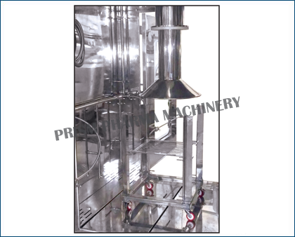 Bin wash automatically as per sets cycles. There are nos. of spraying nozzles for washing at all corners & all side walls for outer washing. Top mounting spraying nozzle is fitted with telescopic pneumatic cylinder to wash inner surface of the bin, Inner washing nozzle move upward & downward during washing for completely washing of bin. The cabinet is having drain pot with recirculation of water connection with pump if required then it can be recalculated. After complete washing cycles then bin is dry by passed filter hot air circulation by air handling unit. After drying of Bin on set temperature then released for new batch safe storage.
